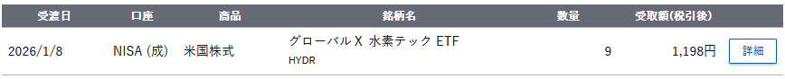 昨日、 "HYDR グローバルX 水素テック ETF" (Global X Hydrogen ETF)から分配金が入りました。