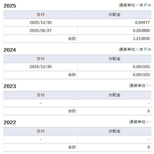 2024年の分配金は少額でしたが、2025年では一気に分配金額が増え、見栄えのする利回りへと成長しました。