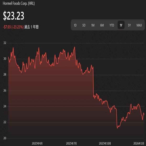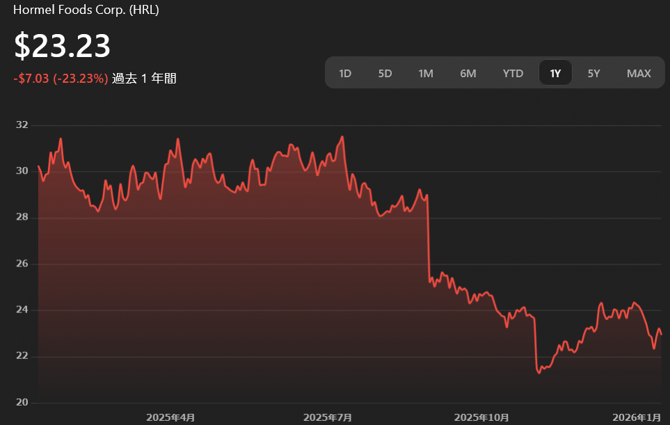 ” HRL ホーメルフーズ " は、庵野が新NISAを始めたばかりの頃に購入した銘柄の一つで、残念ながら購入後は株価が下がり続けています。