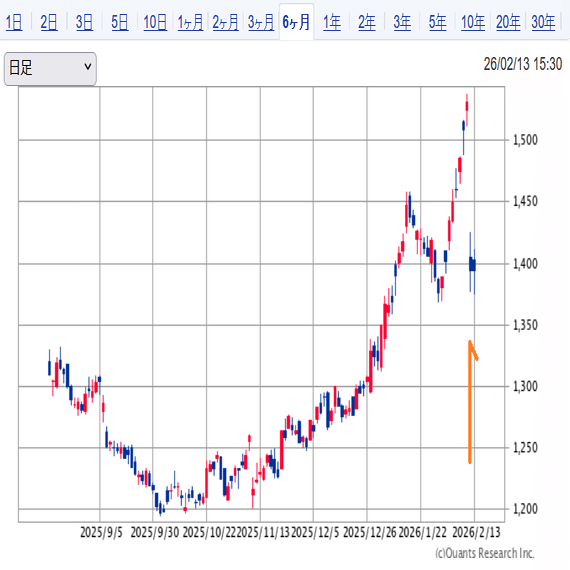 2月12日 終値 1,394円(-8.95%)