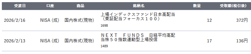 1698(上場インデックスファンド日本高配当)と 1489(NEXT FUNDS 日経平均高配当株50指数連動型上場投信)のETFから分配金が入りました。