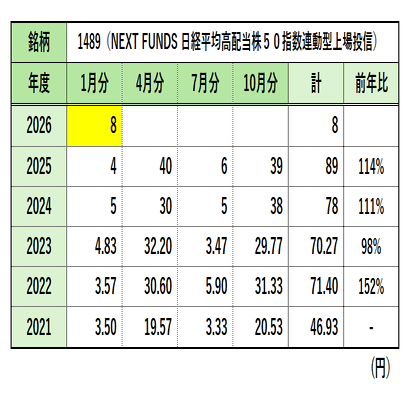 こうやってまとめて比較してみるとわかるのですが、1489(NF・日経高配当50)は通年で減配の年もあったのがわかります。